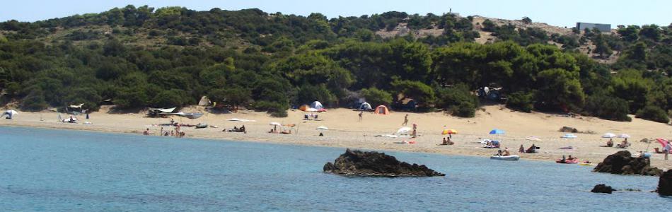 Sandy beach, far enough from the village, with emerald waters and trees that provide shade.